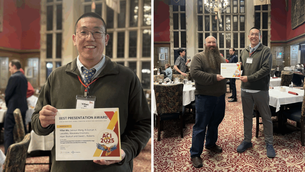 Congratulations to NC State ECE Ph.D. student Yifan Wu on receiving the Best Presentation Award at the 2025 Animal-Computer Interaction International Conference (ACI). Mentored by Professors David Roberts (CS) and Alper Bozkurt (ECE, ASSIST and IConS), Wu presented his paper, “Toward Automated Pain Evaluation in Osteoarthritic Dogs Through Inertial Data and Machine Learning” last month at the conference in Indiana; this is his second time receiving this award.